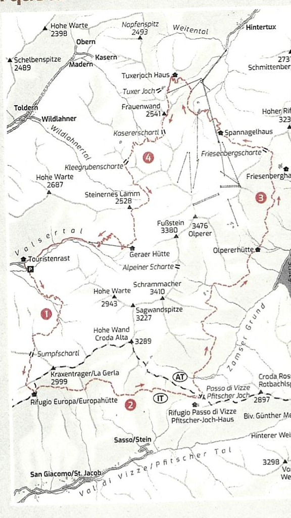 4° giorno, da Tuxerjochaaus. Dis. +700 - 1500 ore 8 circa. Rientro a casa.