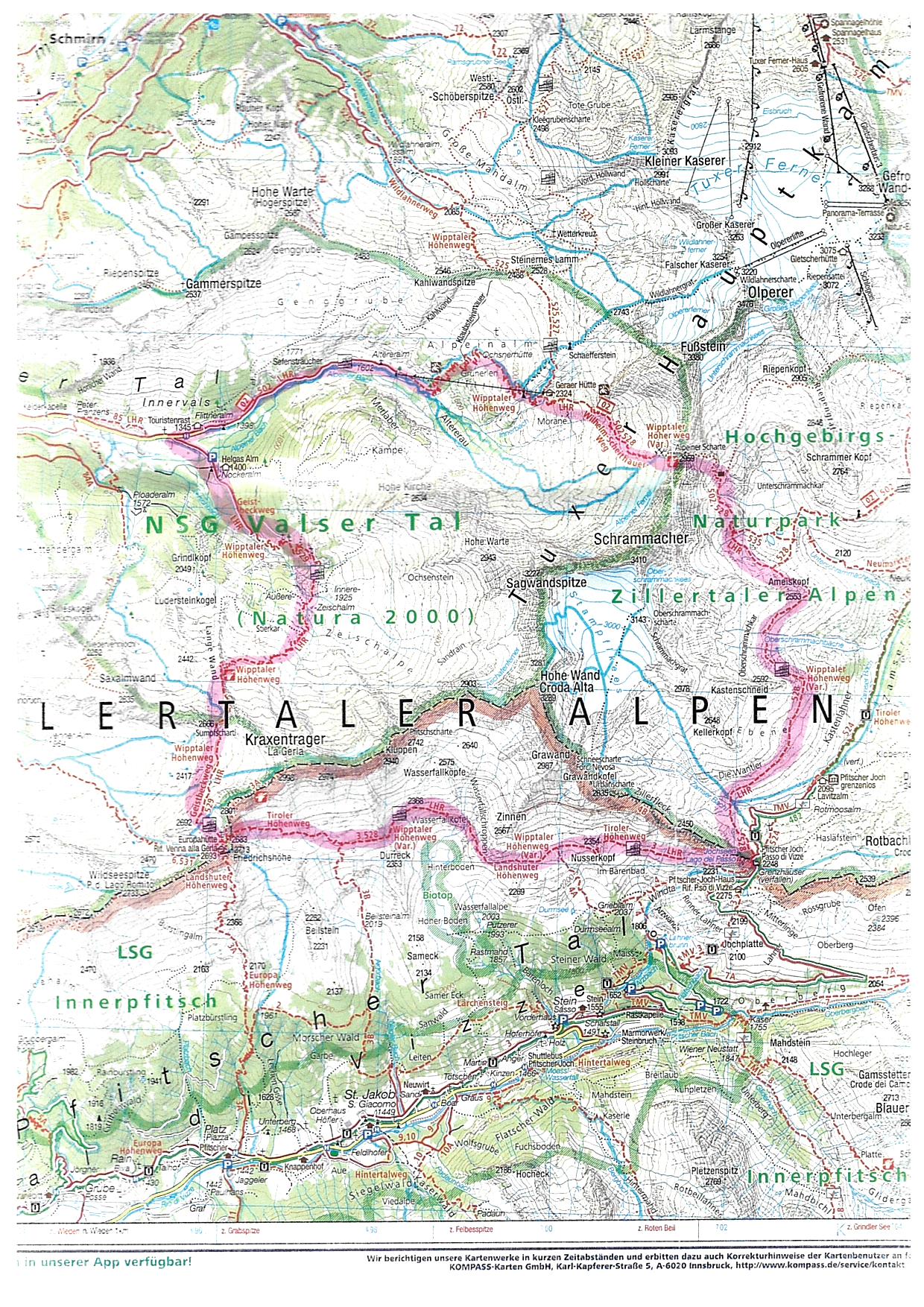 1° giorno, viaggio in auto ed escursione dal parcheggio in alta Valsertal fino al rifugio Europa. Dis. +1500 -160 ore 6/7 circa